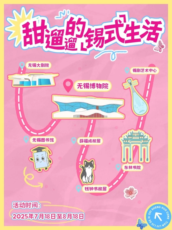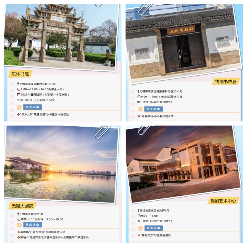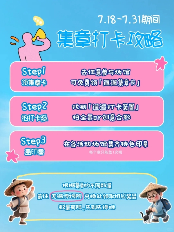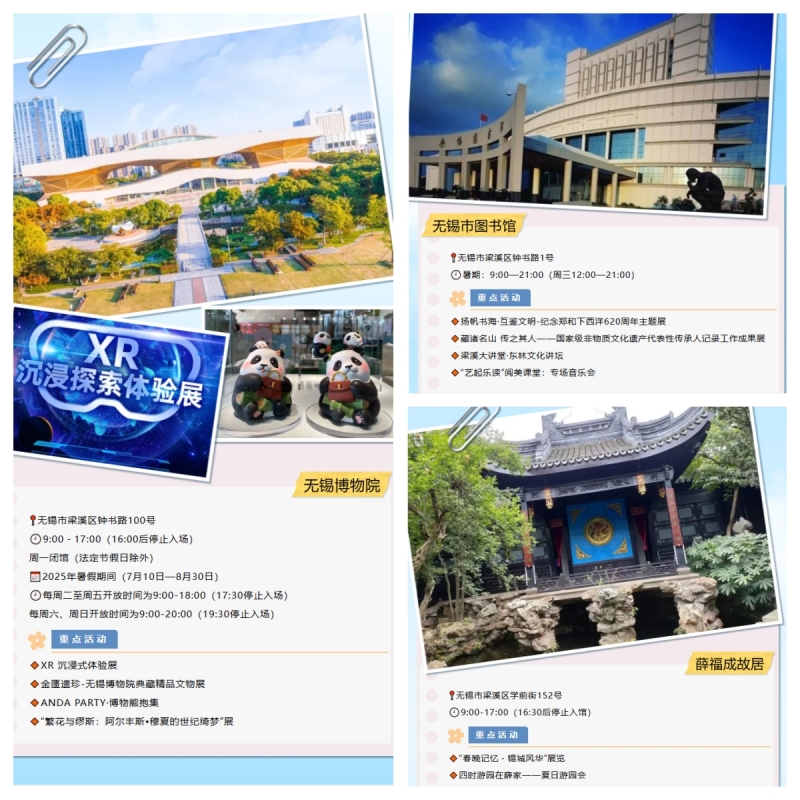 1、7月18日至7月31日,前往無(wú)錫博物院、無(wú)錫市圖書館、薛福成故居、東林書院、錢鍾書故居、無(wú)錫大劇院、錫劇藝術(shù)中心任一場(chǎng)館領(lǐng)取「遛遛集章卡」。