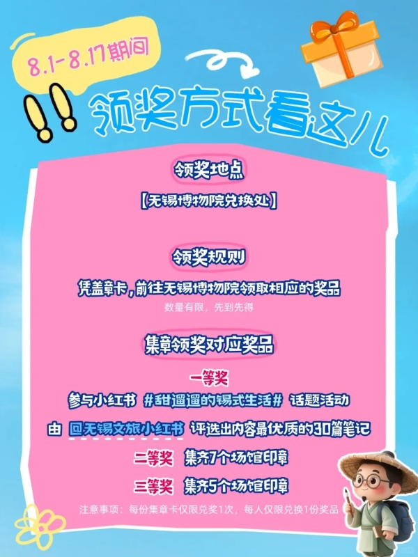 領(lǐng)獎(jiǎng)規(guī)則:憑蓋章卡,前往無(wú)錫博物院領(lǐng)取相應(yīng)的獎(jiǎng)品,獎(jiǎng)品數(shù)量有限,先到先得!