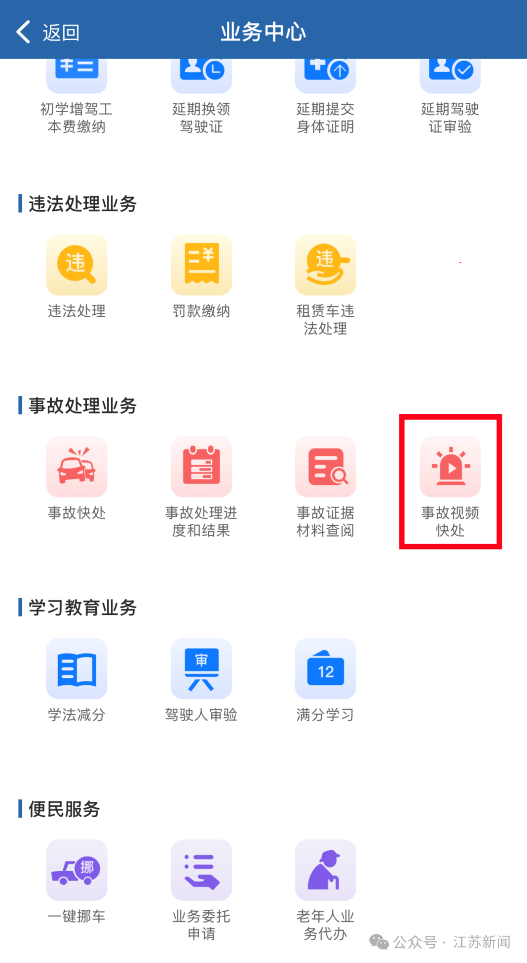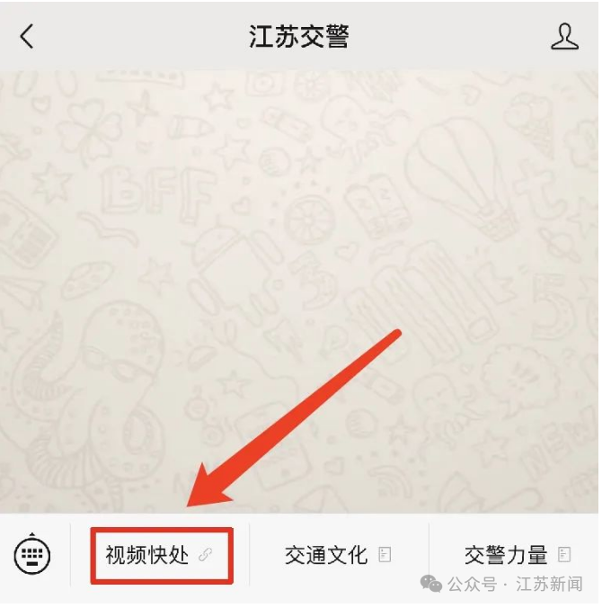 方法一:通過“江蘇交警”微信公眾號或者各地公安交管部門微信公眾號點擊“視頻快處”;