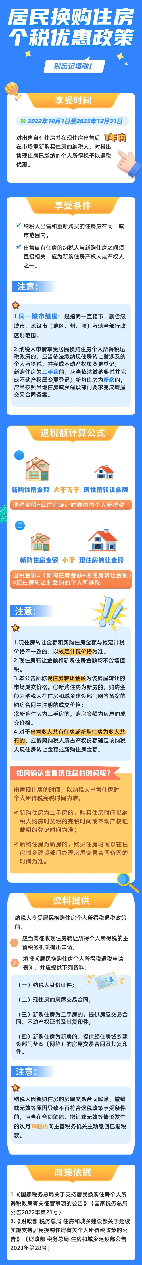 根據(jù)公告,對(duì)出售自有住房并在現(xiàn)住房出售后1年內(nèi)在市場重新購買住房的納稅人,對(duì)其出售現(xiàn)住房已繳納的個(gè)人所得稅予以退稅優(yōu)惠,公告執(zhí)行至2025年底。