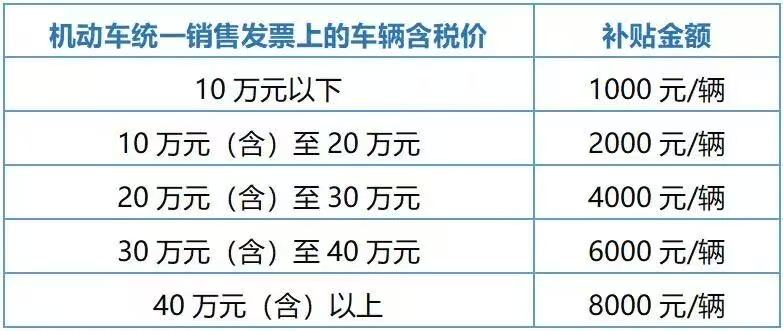 審核通過后,按機(jī)動車銷售統(tǒng)一發(fā)票上的購車價格(含稅價),分別給予一次性補(bǔ)貼。 ![]()