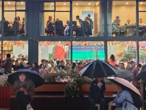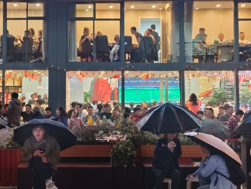 顯云街因“蘇超”半決賽而沸騰。夜幕降臨,一塊塊各具特色的招牌漸次亮起;亭臺中央,檐角下的直播大屏實時傳遞著“蘇超”賽場上的激情。盡管細雨不停,但大屏對面的外擺區域仍然坐滿了顧客。比賽進入膠著時刻,整條街便化作了露天劇場,球迷的心臟隨著攻防轉換共同跳動,不少躲雨的行人也加入助威行列。“店內店外都坐滿了人,相較于以往的雨夜,客流增長了超50%。”大屏正對面的天府龍蝦烤全羊店內同樣播放起了“蘇超”賽事,老板娘薛尤介紹,兩塊直播大屏對門店客流帶動效果明顯,有無錫隊比賽的夜晚場場爆滿。