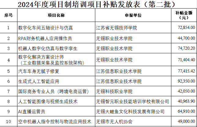 根據《市人力資源和社會保障局市財政局關于加強和改進政府補貼性職業技能培訓管理工作的通知》(錫人社發〔2023〕41號)精神,截至目前,2024年度項目制培訓已有10個項目完成結班,并通過第三方無錫華夏中誠會計師事務所(普通合伙)的審核。現根據第三方提交的項目《決算審核報告》進行補貼發放,發放情況如下: