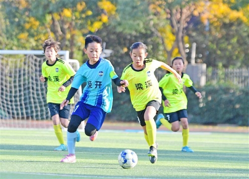 12月9日,在無錫市融成實驗小學,學生們在無錫市小學生校園足球超級聯賽上展開角逐。當日是世界足球日,無錫市各地組織豐富多彩的校園足球活動,讓學生們認識足球、參與足球,盡情感受這項運動的樂趣。