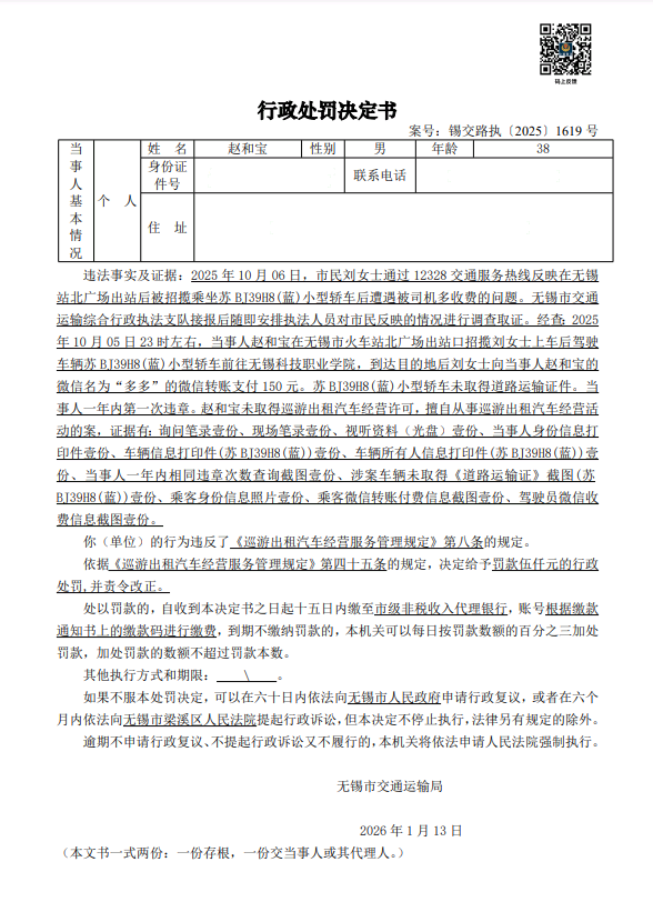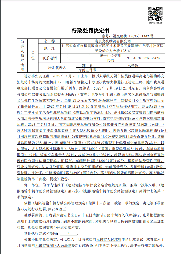 南京亮亮物流有限公司 行政處罰決定書 錫交路執(zhí)[2025]1442號.png 趙和寶 行政處罰決定書 錫交路執(zhí)[2025]1619號.png