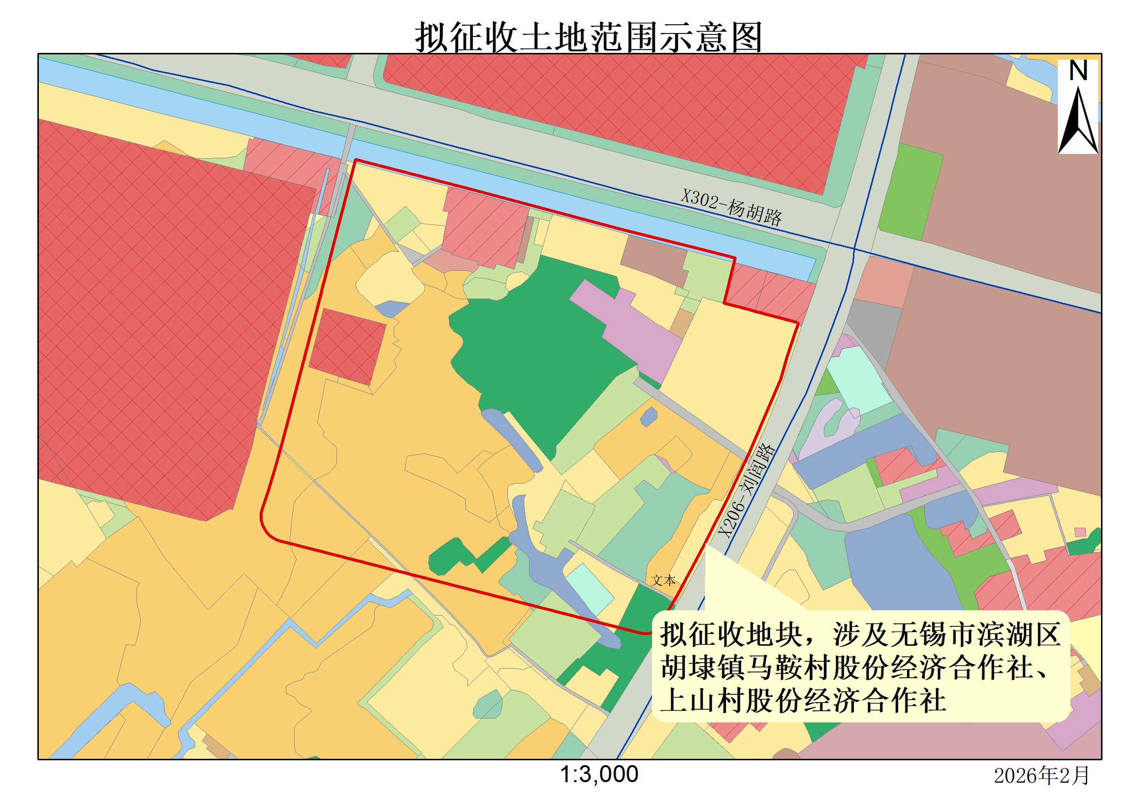 本次擬征收地塊為人民東路與劉閭路交叉口西南側地塊,位于無錫市濱湖區胡埭鎮上山村股份經濟合作社、無錫市濱湖區胡埭鎮馬鞍村股份經濟合作社范圍內。擬征收土地位置詳見附圖。